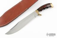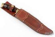 This bowie by Kershaw features a mirror polished blade with false top edge, .185" blade stock and 1.614" blade depth, hidden tang construction. The handle has a brass guard and butt with dymondwood grip. Comes with original box and brown leather sheath. Excellent condition. #1798