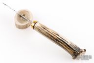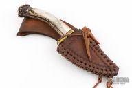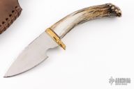This skinner by Bob and Christy Schopp features a polished blade with fileworked spine, .074" blade stock and 1.668" blade depth, hidden tang construction. The handle has a fileworked brass guard and a crown stag grip. Comes with a hand tooled brown leather sheath and original box and papers. Has some pitting and oxidation on the blade, otherwise good condition.
