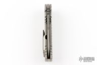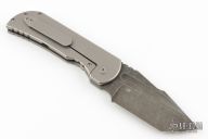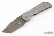 This Dark Gladiator Framelock by Alphahunter Tactical Design features a dark tumble finished tanto blade with notched thumbrest and fullers. The handle is milled and tumbled titanium with a titanium tip up clip and backspacer. Nice detent, blade seating and lock up. S/N 08/10. Comes with zippered case and COA. Excellent condition.