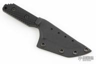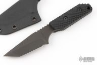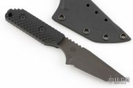 This knife by Strider Knives features a black coated tanto style blade with notched thumbrest, .132" blade stock and 1.231" blade depth, full tang construction. The handle has a black G-10 scales with gunner grip. Lanyard hole in pommel. Includes kydex sheath. Excellent Condition.