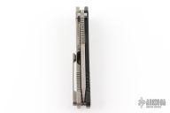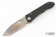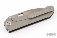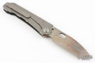 This 187 DPT Drop Point by Medford Knife and Tool, features a vulcan finished drop point blade with notched thumbrest and thumbhole. The handle has a black G-10 front scale and a stonewashed titanium lockside and titanium clip. Nice blade seating, detent and lockup. Excellent condition.