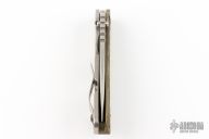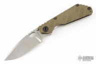 This MSC SNG framelock folder by Mick Strider features a stonewashed blade and a Crosshatch Ranger Green G-10 and stonewashed titanium frame and tip up titanium clip. Includes Hinderer "Lock Bar Stabilizer" for maximum reverse lock retention. Nice detent, lockup and blade seating. Excellent condition.