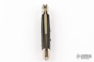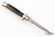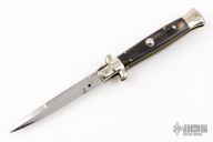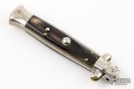 This PickLock features a polished bayonet ground blade with false top edge. The handle has nickel silver bolsters, front and rear, horn scales, brass liners, stainless spring. Has scuffs, scratches, and patina. Great condition for its age.