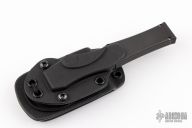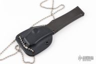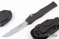 This Halo III by Microtech features a silver finished partially serrated blade. The handle has a black aluminum frame with blasted hardware. Comes with kydex neck sheath and a belt Kydex sheath. Also includes original box and paperwork. Box has writing on the outside of it. Dated 11/1999 and s/n 1232. Excellent condition.