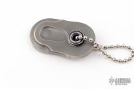 Titanium dog tag knife by Triple Aught Design. It features bead blasted titanium construction with a plastic chain ring that can be tightened down to lock the blade in the open or closed position. Includes original paper. Has some patina and light scuffs, excellent condition otherwise.