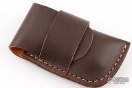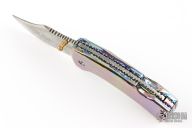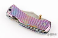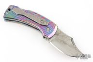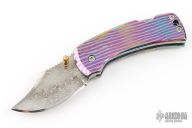 This lockback folder by EMA Forge features a Damascus blade with notched thumbrest and single brass thumbstud. The handle has a NiobiuTi frame with a fileworked Damascus backspacer, tip down Damascus clip. Nice lockup and blade seating. Comes with a brown leather sheath. New from maker.
