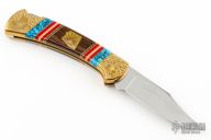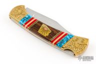 This Buck Model 112 knife Customized by David Yellowhorse is a lock back with brass bolsters, ironwood, turquoise, and brass spacers. Mirror polished blade. Strong lock up. Comes with original papers and small plaque. Excellent condition.