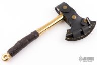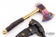 This Axe by Ema Forge features a Timascus head with two Damascus screws that attach it to the gold anodized titanium handle with leather wrap. Comes with a black leather sheath with a slot for the wrench to remove the screws and head. New from maker.