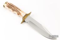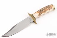 This Fighter by Sid Jirik features a mirror polished blade with hidden tang construction. .249" Blade Stock. 1.348" Blade Depth. Brass double guard with stag grip and brass butt. Has a couple light scuffs, excellent condition otherwise.