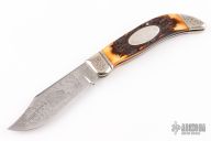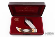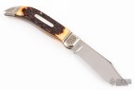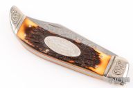 This Bulldog by Schrade features an engraved satin blade with nail nick. The handle has nickel silver bolsters with jigged bone covers over brass liners and stainless steel spring. Commemorative escutcheon. Comes with original box, and papers. #2961. Excellent condition.