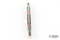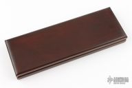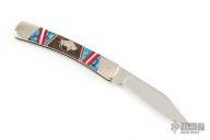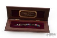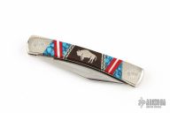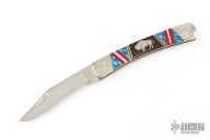 This Buck knife Customized by David Yellowhorse is a slipjoint with engraved nickel silver bolsters with nickel silver inlays. Turquoise, red, pearl, and nickel silver spacers. Image of a buffalo inlay in the ironwood scales. Mirror polished blade. Includes a wood display case and box. Excellent condition.