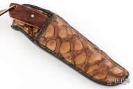 This Hunter by Digger Dan features a Damascus (416 layer 5160/15N20/Nickel) blade with a full tang construction.  .141" Blade Stock.  1.510" Blade Depth.  The handle features stabilized redwood burl scales with red/white liners.  Includes pirarucu sheath, and original box. Beads are ancient Huisache Wood. New from maker!