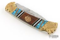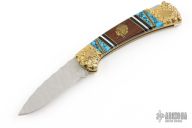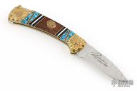This Buck Model 112 has been customized by David Yellowhorse. The blade features a mirror polished clip point blade with a single nail nick. The handle features a carved brass frame with multi piece inlays. Includes wood, felt lined display box with brass plaque, and original box and papers. Excellent condition. #0850