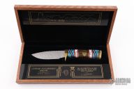 Beautiful fixed blade customized by David Yellowhorse. "Knapped" blade with brass guard and pommel. Brass "Cuthair Yellowhorse" inlay in ironwood. Spacers of turquoise, brass, black, pearl and red. Comes in original wooden display box with engraved plaque and original box and papers. Excellent condition. S/N 0714