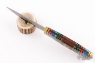 Beautiful fixed blade customized by David Yellowhorse. "Knapped" blade with brass guard and pommel. Brass "Cuthair Yellowhorse" inlay in ironwood. Spacers of turquoise, brass, black, pearl and red. Comes in original wooden display box with engraved plaque and original papers. Excellent condition. S/N 0702