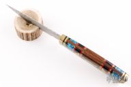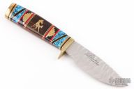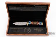 Beautiful fixed blade customized by David Yellowhorse. "Knapped" blade with brass guard and pommel. Brass "Cuthair Yellowhorse" inlay in ironwood. Spacers of turquoise, brass, black, pearl and red. Comes in original wooden display box with engraved plaque and original box and papers. Excellent condition. S/N 0314
