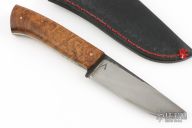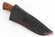 This Hunter by Last Knives features a hand rub satin finished blade with a visible temper line and forge finished flats, .162" blade stock and 1.205" blade depth, full tang construction. The handle has teak burl scales with brass pins. Comes with a black leather sheath and COA. New from maker.