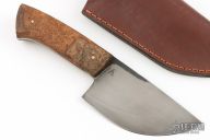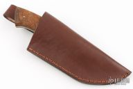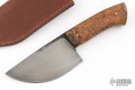 This Mini Gobang by Last Knives features a hand rub satin finished blade with a hamon and forge finished flats, .147" blade stock and 2.041" blade depth, full tang construction. The handle has teak burl scales with brass pins. Comes with a brown leather sheath and COA. New from maker.
