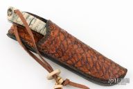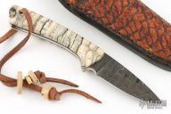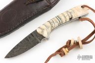 This Hunter by Digger Dan features a Damascus (416 layer 5160/15N20/Nickel) blade with a full tang construction.  .138" Blade Stock.  1.042" Blade Depth.  The handle features blue mammoth molar scales with black liners.  Includes elephant sheath, and original box. Beads are mammoth ivory. New from maker!