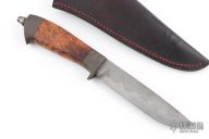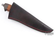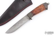 This Takedown Hunter by Last Knives features a hand forged hand rub satin finished blade with a nice hamon made from Aldo's W2, .183" blade stock and 1.057" blade depth, hidden tang construction. The handle has a parkerized mild steel guard and butt, Red Amboyna burl wood grip. Comes with a black leather sheath and COA. New from maker.