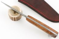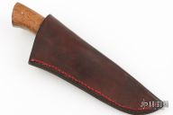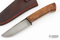 This Hunter by Last Knives features a hand rub satin finished blade with a visible temper line and forge finished flats, .173" blade stock and 1.159" blade depth, full tang construction. The handle has teak burl scales with brass pins. Comes with a brown leather sheath and COA. New from maker.