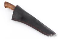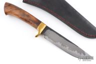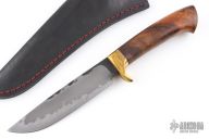 This Hunter by Last Knives features a hand rub satin finished blade with a nice hamon and forge finished flats, .176" blade stock and 1.200" blade depth, hidden tang construction. The handle has a brass guard and a teak burl grip. Comes with a black leather sheath and COA. New from maker.