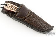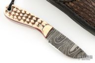 This Hunter by Digger Dan features a Damascus (416 layer 5160/15N20/Nickel) blade with a full tang construction.  .109" Blade Stock.  .90" Blade Depth.  The handle features armadillo scales with red liners.  Includes blue shark sheath, and original box. Beads match the handle materials. New from maker!