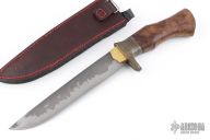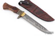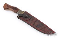 This Huskar Special by Last Knives features a hand forged hand rub satin finished SK3 Steel blade with forged flats and nice hamon, .205" blade stock and 1.345" blade depth, hidden tang construction. The handle has a brass and mild steel guard and a teak burl grip. Comes with a hand tooled brown leather sheath and COA. New from maker.