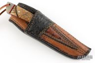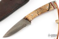 This Hunter by Digger Dan features a Damascus (416 layer 5160/15N20/Nickel) blade with a full tang construction.  .140" Blade Stock.  1.041" Blade Depth.  The handle features light brown mammoth scales with black/red liners with musk ox accents.  Includes ostrich sheath, and original box. Beads are musk ox. New from maker!