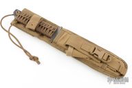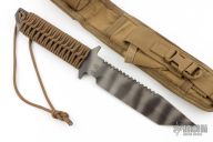 The BN-SS by Strider features a tiger stripe tanto blade with a serrated top edge .248" blade stock and 1.490" blade depth, full tang construction. The handle has a green paracord wrapped handle. Comes with a tan nylon sheath. New condition.