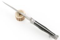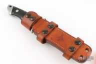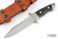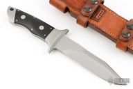 This one is a 1of1, even though it is s/n 32. The customer ordered the handle length 1/4" shorter than standard. He also ordered the lower tip in line with the middle of the handle. Front and rear bolsters made of 416 SS, black linen micarta scales with 3/8" diameter escutcheon bolts. Made September 27, 1994.