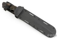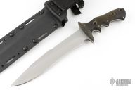 This Flesheater by Jim Hammond features green linen micarta scales. Full tapered tang construction. Blade is bead blast finish with 1/2 of top section sharpened and 2.75" worth of notched thumbrest. .245" blade thickness and 1.543" blade depth. Feels great in hand, light and moves through the air like a breeze. Comes with a kydex sheath with belt loop. The Handle was inspired by Filipino Escrima Master Arsenio Advincula allowing four different grip positions facilitating maximum fighting efficiency for three primary combative distances plus a forward working grip. In the forward grip the index finger is wrapped around the lower guard for maximum control work. First position "modified hammer" grip is forward, finger against the guard. Second position the grip is re-positioned toward the rear for maximum reach. Third the hand is shifted another finger groove back for chopping. This knife is in excellent condition. Truly a classic.