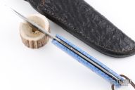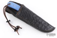 This Hunter by Digger Dan features a Damascus (416 layer 5160/15N20/Nickel) blade with a full tang construction.  .110" Blade Stock.  1.299" Blade Depth.  The handle features brain coral scales with black liners.  Includes gar fish sheath, and original box. Beads are black coral. New from maker!