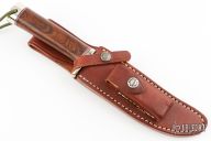 This Model 12-6 Little Bear Bowie by Randall Made Knives features a satin finished blade with notched thumbrest and sharpened top edge, .220" blade stock and 1.198" blade depth, hidden tang construction. The handle has a nickel silver guard and butt, desert ironwood grip with red/white/blue spacers. Comes with a brown leather sheath and a zippered case. Excellent condition.