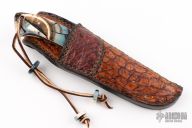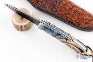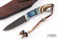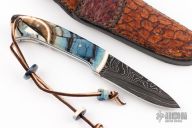 This Hunter by Digger Dan features a Damascus (416 layer 5160/15N20/Nickel) blade with a full tang construction.  .138" Blade Stock.  1.087" Blade Depth.  The handle features green (blue/brown) mammoth scales with black/white liners.  Includes gar fish sheath, and original box. Beads are matching tusk. New from maker!