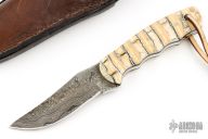 This Skinner by Digger Dan features a Damascus (416 layer 5160/15N20/Nickel) blade with a full tang construction and thumb ramp.  .165" Blade Stock.  1.037" Blade Depth.  The handle features natural mammoth molar scales and black liners.  Includes ostrich sheath, and original box. Beads are musk ox. New from maker!