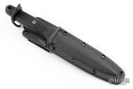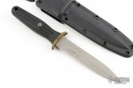 This Applegate-Fairbairn Combat Dagger (#3858) has a bead blasted partially serrated spear point blade with hidden tang. Blade stock is 3/16", depth is 1-1/16". Handle is non-slip black polymer with contoured grooves, bead blasted brass guard, and lanyard hole. Comes with kydex sheath and original box. Sheath rubber ring is broken. Has some scuffs,  otherwise excellent condition.