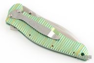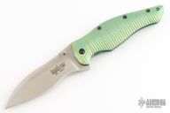 This Bump 1590GR (#0990) assisted opening flipper from Kershaw has a satin finished S30V stainless steel spear point blade with dual thumb studs. Handle is fluted green titanium, tip down stainless steel clip, and lanyard hole. Comes with original box, papers, and zipper case. Has a couple light scuffs, excellent condition otherwise.