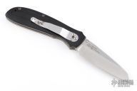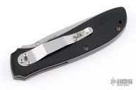 This Random Task Assisted Opening Linerlock Folder has a satin finished CPM 440V stainless steel wharncliffe blade with single thumbstud and notched thumb rest. Handle is black polished G10 with titanium liners, black G-10 backspacer, bead blasted titanium tip down clip, and lanyard hole. Discontinued due to high cost of manufacturing, lots of hand done work. Comes in a zipper case. Has scuffs, scratches, and some rusting. Fair condition.