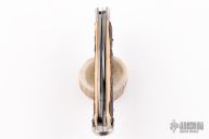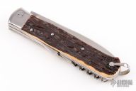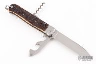 This vintage scout knife by Bargeon features two blades with nail nicks, one with can opener, lanyard bail/blade stop, and cork screw. The handle has stainless bolsters and faux bone scales. Coin edge stainless liners and stainless springs. Has some scuffs and scratches, great condition otherwise.