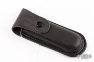 This Bob Terzuola designed knife from Spyderco has a satin finish partially serrated edge blade and black aluminum scales. Clip is interchangeable to up or down positions according to user preference. Has some scuffs and scratches and some light rusting. Comes in a leather belt sheath. Good user condition.