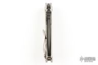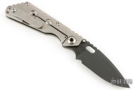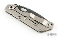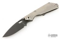 This Mick Strider Performance series SNG framelock folder features a black drop point blade with thumbhole and notched thumbrest. The handle has a stonewashed titanium frame with titanium clip, tip up carry. Jimping on blade spine. Includes Hinderer "Lock Bar Stabilizer" for maximum reverse lock retention. Nice lockup, detent, and blade seating. Excellent condition.
