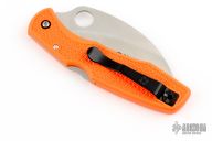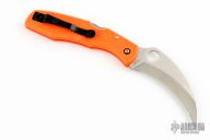 This SpyderHawk by Spyderco features a satin finished fully serrated hawkbill blade with thumbhole, orange FRN frame and black stainless steel tip up clip. New condition. Comes with original box and papers.