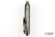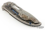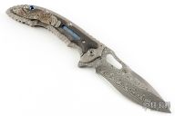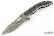 The Avenger by Flavio Ikoma features a Damascus blade with notched thumbrest and flipper, and a thumbhole. the handle has a textured titanium frame, lightning strike carbon fiber overlays with super conductor underlays, super conductor backspacer with carbon fiber liners, tip up carved titanium clip. Interior of frame is jeweled. Rides on IKBS, nice detent, lockup and blade seating. Excellent condition. Comes with a zipper case.