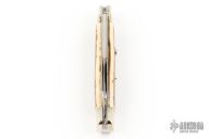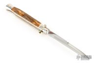 This 13" Italian Wasp Picklock Auto by Burn Knives features a mirror polished bayonet blade with false top edge. The handle has nickel silver bolsters, front and rear, bark mammoth ivory scales, 410 stainless steel liners and backspacer. Has a round push button and a safety. Perfect function. Comes in a zipper case. Excellent condition.