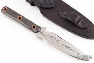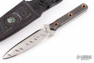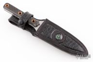 This dagger by Shane Gallagher features a handle forged and satin finished double edged blade, .205" blade stock and 1.122" blade depth, full tang construction. The handle has carbon fiber scales with copper tube pins. Comes with a black leather sheath with a compass and alligator emboss inlay, also has optional leg straps. Excellent condition.