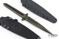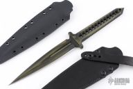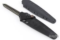This Warhead MK2 by ZU Bladeworxs features an apocalyptic black/green blade with sharpened top edge, .317" blade stock and 1.189" blade depth, integral construction with notched tang and hole pattern in handle. Comes with a kydex sheath and leather sheath. Excellent condition.