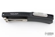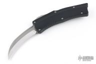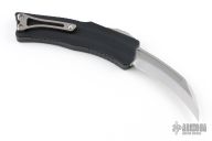 This ROC by Heretic Knives features a satin finished blade with fullers and notched thumbrest. The handle has a black aluminum chassis with a tip down stonewashed titanium clip with ball. Textured push button. Comes with original box and loob. Excellent condition.