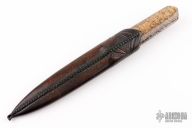 "I make mostly daggers, fighters and what I call “Kwaikens” but also swords and folding knives. I primarily use 1050 carbon spring steel and damascus of various compositions and on occasion, stainless steel for the blades. For the 1050 I employ a clay “tempering” technique that gives the blade a beautiful temper line (hamon) as well as a hard edge while maintaining a flexible core of the blade. These blades are rough ground and then finished off by hand with files and sandpaper before the final stage of etching the blade to bring out the hamon. When it comes to damascus, I tend to lean towards a simpler random or a twist pattern that goes with the overall simplistic scheme of my knives. These blades are worked and finished in a similar fashion as the carbon steel ones. I use stainless steel, mostly Damasteel stainless damascus, for folders, art knives ( for ex. Skull Cleaver and Druid Sickle) and some full-tang dress-knives, my Tuxer model, or upscale hunting/skinning-knives. For the handles and wooden sheaths I use rare exotic hardwoods, ancient ivories and bone material from all over the world. Even large pieces of natural amber has found its way onto a couple of my knives. A few wood favorites are Snakewood for its amazing striped grain pattern, Masur birch, Eucalyptus , and Redwood burl for its sometimes silky appearance."
