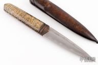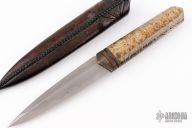This Dagger by Anders Hogstrom features a double-edged 1050 blade with beautiful hamon, .247" blade stock and 1.115" blade depth, hidden tang construction. The handle has an antiqued copper guard, beautiful high gloss finished cross-sawn x-cut Masur Birch wood grip. Comes with a hand tooled leather sheath and a velcro case. Also includes COA dated 2018. Excllent condition.